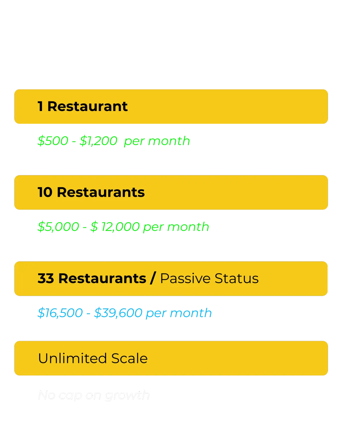 Once you sign up 33 restaurants, you reach PASSIVE STATUS. That means you can stop bringing in new restaurants if you choose, and we will continue paying you 30% of the net profit.